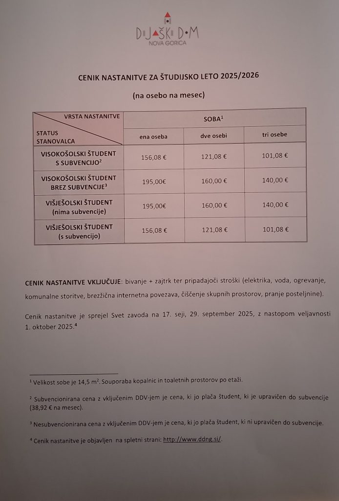 Avtor: DDNG | 3. 10. 2025 | Obvestila, Študentje CENIK NASTANITVE ZA ŠTUDIJSKO LETO 2025/20262025-10-032025-10-03https://ddng.si/wp-content/uploads/2017/02/ddng-logo_top2_180.pngDijaški dom Nova Goricahttps://ddng.si/wp-content/uploads/2017/02/ddng-logo_top2_180.png200px200px Zadnje objavePROGRAM EKOŠOLAVELIKA DOBRODELNA AKCIJA – ADVENTNI KOLEDAR 2025EPAS – ŠOLA AMBASADORKA EVROPSKEGA PARLAMENTA (info točka)